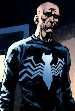 In the 2004 story "Venomous", Brock experiences a crisis of faith and decides to sell the symbiote, knowing he will rapidly die from his cancer without it, intending to donate the $100 million received from the sale to charity on the grounds that the symbiote would find another host once he dies anyway.[84] The symbiote is purchased by crime boss Don Fortunato for his son Angelo Fortunato.[85] Angelo briefly becomes the second Venom but proves an unworthy host, and the symbiote abandons him mid-jump allowing him to fall to his death. Upon learning of Angelo's death, Brock feels responsible and attempts suicide by slitting his wrists.[86] Brock next appeared in the 2007 story "The Last Temptation of Eddie Brock", where he is rapidly succumbing to cancer, and experiencing hallucinations of "Venom". Finding a comatose Aunt May in the same hospital, dying from a gunshot, the Venom hallucination persuades him to kill her. Brock, dressed in a novelty replica of Spider-Man's black costume at the demand of "Venom",[87] murders an "angel of mercy" nurse to test if he can still kill, but ultimately refuses to kill May because she is innocent. When Peter visits May, he finds Eddie, who has repeatedly cut his own wrists to get rid of "Venom". Eddie asks for Peter's forgiveness before jumping out of a window, but Peter manages to catch him. Awakening chained to his bed, Brock finds he can still see "Venom" but tells him that he accepts its presence as long as it knows that Brock is in control.[88]