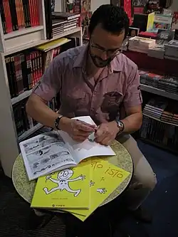 Xavier Àgueda was born in 1979 in Barcelona. Àgueda is an engineer and high school teacher, creating cartoons in his spare time. Besides creating El Listo, Àgueda has written a short story in L'estiu d'Ulises i altres contes as well as the prologues of Comics 2.0: Antología del Webcómic, Zombess, Crónicas PSN 3, and Spooky Volumen 2. Moreover, Àgueda is involved with various webcomic blogs, collaborates with the Comic Book Guide, and writes textbooks for Editorial Casals.[1] Àgueda often uses his illustrations in the classes he teaches in technology and natural science.[2]
