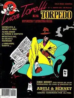 Having tried in a number of professions in various locations in the world, Abulí began his career as a translator and writer of comics in Spain in the early 1980s. With the influential publisher Josep Toutain, Abulí collaborated with the veteran artist Alex Toth to conceive Torpedo 1936. The relationship was short-lived, as Toth withdrew from the project due to creative differences in 1981.[1] He was replaced by the artist Jordi Bernet which started a very productive working relationship and resulted in a long series. Torpedo achieved popular international success, an Angoulême International Comics Festival award, and eventually a dedicated comics magazine of its own named Luca Torelli es Torpedo in 1991.[2]