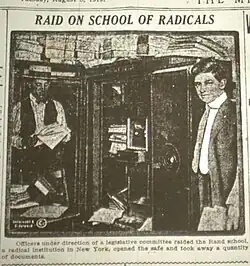 In the late 1910s, Shemitz attended the Rand School.[10] At Rand in the same period were Nerma Berman, the wife of the Soviet spy Cy Oggins, and CPUSA Fosterite Carrie Katz, the first wife of philosopher Sidney Hook.[11][12][13] In May 1920, Algernon Lee, educational director, presided over the graduation of the second-largest class ever at Rand, whose members included: John J. Bardsley, William D. Bavelaar, Annie S. Buller, Louis Cohan, Harry A. Durlauf, Clara Friedman, Rebecca Goldberg, William Greenspoon, Isabella E. Hall, Ammon A. Hennsey (Ammon Hennacy), Hedwig Holmes, Annie Kronhardt, Anna P. Lee, Victoria Levinson, Elsie Lindenberg, Selma Melms (first wife of Ammon Hennacy).[14]), Hyman Neback, Bertha Ruvinsky, Celia Samorodin, Mae Schiff, Esther T. Shemitz, Nathan S. Spivak, Esther Silverman, Sophia Ruderman, and Clara Walters.[15][10]