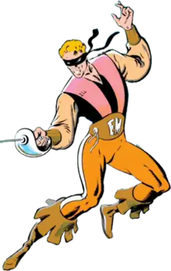 Larry Ekler was the son of hard-working Milton Ekler, who came from a lower-class background but never gave up on the American dream, although he eventually died penniless. Larry decided that the American dream was a sham. Larry intended to take up the cause of the common man and start a revolution. To really start things going, he and his followers became determined to publicly assassinate Captain America. Styling himself as a "defender of the people", Everyman sought to avenge his father's death on all of society. His primary weapon is a sword which can emit a lethal electrical shock. Everyman challenged Captain America to a duel to the death at the Statue of Liberty. When he began to lose during the duel, Everyman took one of his own followers hostage, but that did not prevent Captain America from defeating him and taking him into custody.[1]