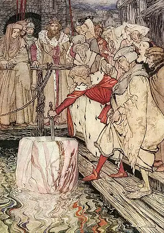 Romance tradition elaborates on how Arthur came into possession of Excalibur. In Robert de Boron's c. 1200 French poem Merlin, the first known tale to mention the "sword in the stone" motif, Arthur obtained the British throne by pulling a sword from an anvil sitting atop a stone that appeared in a churchyard on Christmas Eve.[19] In this account, as foretold by Merlin, the act could not be performed except by "the true king", meaning the divinely appointed king or true heir of Uther Pendragon. (As Thomas Malory related in his English-language Arthurian compilation, the 15th-century Le Morte d'Arthur, "whoso pulleth out this sword of this stone and anvil, is rightwise king born of all England."[20][d]) The scene is set by different authors at either explicitly London (historical Londinium) or generally in the land of Logres (which can be a city and also associated with London[21]), and might have been inspired by a miracle attributed to the 11th-century bishop Wulfstan of Worcester.[22] After many of the gathered nobles try and fail to complete Merlin's challenge, the teenage Arthur, who up to this point had believed himself to be biological son of Ector and went there as a squire to his foster brother Kay, succeeds effortlessly. Arthur first achieves this feat by accident while unaware of the contest and unseen. He then returns the sword to its place in the anvil on a stone, and later repeats the act publicly as Merlin comes to announce his true parentage.