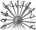 - ↑ Nineteenth-century poet Alfred, Lord Tennyson, described the sword in full Romantic detail in his poem "Morte d'Arthur", later rewritten as "The Passing of Arthur", one of the Idylls of the King: "There drew he forth the brand Excalibur, / And o'er him, drawing it, the winter moon, / Brightening the skirts of a long cloud, ran forth / And sparkled keen with frost against the hilt / For all the haft twinkled with diamond sparks, / Myriads of topaz-lights, and jacinth-work / Of subtlest jewellery."