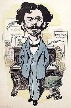 Fau was born in Poitiers in 1858.[1] He produced copious illustrations under the pseudonym "Fanfare". He made the illustrations for the drama by Ferny "Le Secret du manifestant" at the "shadow show" in the cabaret Le Chat Noir.[2] He also illustrated the shadow show Une Affaire d'honneur by Jules Jouy at Le Chat Noir.[3] In 1890 Le Chat Noir put on his Idylle, a revue in one act with music by Charles de Sivry.[4] His illustrations appeared in the Chat Noir humorous magazine and also in Le Rire. He illustrated many children's books throughout his career,[1] and was a satirist.[5] Fau was also versed in Art Nouveau, and exhibited at the Salon des Cent in 1895.[6]
