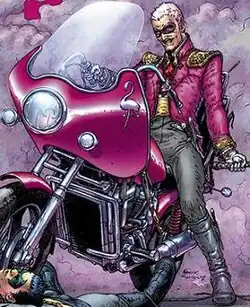Eduardo Flamingo is an emotionless, unfeeling pink-wearing flamboyant killer who has a tendency to eat his victim's faces after he has murdered them. Jason Todd (the second Robin, who had become Red Hood) has rallied a defense against Flamingo, but sustains bullet wounds to the face and knee-cap. Flamingo then turns his attentions to Red Hood's partner Scarlet. Flamingo then tugs at the seams of Scarlet's mask before she gashes him with one of her blades. Feeling responsible for the girl and her condition, Robin jumps into the fray to help, but is shot in the spine, paralyzing him from the waist down. Dick Grayson (who is operating as Batman) delivers a boot to Flamingo's face. When Dick is nearly tossed over the side of the building, Jason uses a construction digger to scoop Flamingo up and deposit him over the edge, sending him plummeting to the Earth below. Commissioner James Gordon later tells Batman that Flamingo's body was never found.[2]