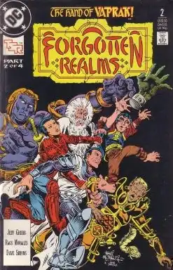 In 1989, DC Comics began publishing the Forgotten Realms comic series, written by Jeff Grubb. Each issue contained twenty-six pages, illustrated primarily by Rags Morales and Dave Simons.[1] The 19 issues produced by Morales were his first professional works. Tom Raney illustrated issues #17 and #20. Elliot S. Maggin served as an editor for DC from 1989 to 1991 and oversaw the licensed TSR titles, including Forgotten Realms. Twenty-five issues were published in total, with the last being released in 1991. Kim Yale served as an editor for DC from 1991–1993 and oversaw their licensed titles.[2] Grubb wrote all 25 issues.[3] A fifty-six page annual Forgotten Realms Comic Annual #1: Waterdhavian Nights, illustrated by various artists, was released in 1990, illustrated by Tom Raney.