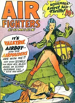 In 1942, he joined Hillman Periodicals, where he drew such features as "Iron Ace" (from its premiere in Air Fighters Comics #2, Nov. 1942),[6] "Boy King" and "Gunmaster", and the following year began work on his most prominent Golden Age character, Airboy. That aviation hero, created by writer Charles Biro with scripter Dick Wood and artist Al Camy, appeared initially in Air Fighters Comics, later renamed Airboy Comics.[5] Aside from Airboy himself, the feature was known for the sexy antagonist Valkyrie, a cleavage-baring Axis aviatrix who soon defected and became his ally.[7]