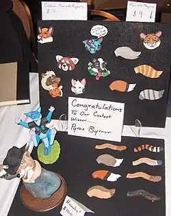 Fans with craft skills create plush toys and also build elaborate costumes called fursuits,[19] which are worn for fun or to participate in parades, convention masquerades, dances, or fund-raising charity events (as entertainers).[20] Fursuits range from designs featuring simple construction resembling some entertainment and sports mascots[15] to those with more sophisticated features such as moving jaw mechanisms, animatronic parts, prosthetic makeup, and other features. Fursuits range in price from $500, for mascot-like designs, to upwards of $10,000 for models incorporating animatronics.[21] About 80% of furries do not own a full fursuit.[15][16][17] Some fans may also wear "partial" suits consisting simply of ears and a tail, or a head, paws, and a tail.[15] A much larger proportion of individuals who attend conventions own a full or partial fursuit—45%, according to a survey done at Anthrocon 2018—which has been attributed to convention attendees' generally higher likelihood of being able to afford to buy a fursuit if they can afford convention travel expenses.[22]
