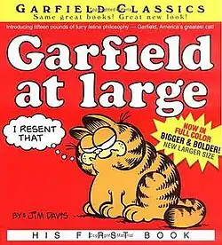 Garfield at Large is the first compilation book of Garfield comic strips. The book was originally published by Ballantine Books in the United States in 1980 and the strips date from June 19, 1978, to January 22, 1979. This book introduced the "Garfield Format" to the comic book market. Prior to its publication, comic strip compilations were most commonly formatted like a standard paperback book with the panels running down the page. Jim Davis, Garfield's author, disliked the idea and convinced Ballantine to print the strips from left to right, as they would have appeared in the newspaper. This resulted in the final product being shorter from top to bottom and much wider from side to side than the average paperback book.[1] The book was #1 on The New York Times bestseller list for almost two years.[2]