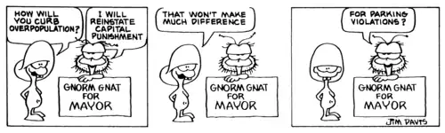 Gnorm Gnat is an American gag-a-day comic strip by Jim Davis based on fictional insects, with the primary focus on a gnat named Gnorm. The strip appeared weekly in The Pendleton Times in Pendleton, Indiana, the only newspaper to publish the strip,[1] from 1973 to 1975, but failure to take the character to mainstream success led Davis to instead create the comic strip Garfield. Mike Peters, (creator of Mother Goose and Grimm) has said that Gnorm Gnat is now a part of "cartoon folklore" as a failure that paved the way for major success.[2]