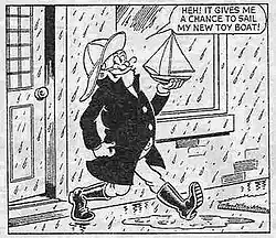 Some of the stories involved his dad, an even older man with an even longer beard than him. Despite their advanced ages, they enjoyed a father-son relationship similar to that of Dennis the Menace and his dad; a typical story would be about Grandpa getting involved in some kind of mischief, being caught by his father and ending up getting a spanking. In a June 1956 strip, Grandpa was revealed to have been born in 1874, making his age 82. In 1957 the series was terminated.