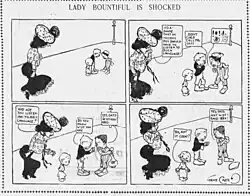 The first known grawlix appeared in November 1, 1901 story of Gene Carr's comic strip Lady Bountiful, with the title "Lady Bountiful is Shocked", and continued to expand its usage throughout 1902 and 1903.[4] In December 12, 1902, The Katzenjammer Kids became the second comic to adapt grawlixes, among many other comic trends seen today.[4]