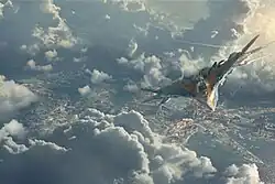 Special effects makeup designer David White took head and body casts of actors, such as Bautista, to experiment with materials used to create the characters. White said, "James always pushed for practical and makeup effects. He wanted, like me, to see the real deal there on set." White was careful not to use "modern" creature designs to ensure they did not fall short in Gunn's uniquely envisioned world. White and his team created upwards of 1,000 prosthetic makeup applications and 2,000 molds of different-colored aliens.[137] For the specific aesthetic look to the film, Gunn wanted to create "a colorful science-fiction world", and include elements of 1950s and '60s pulp movies, citing the Ravagers' spaceships, which he compared to muscle cars, as an example of the latter.[138] Science fiction artist Chris Foss inspired and helped design the final look of some of the spacecrafts that appear in the film.[139] The Mass Effect video game series, Flash Gordon, Farscape and Star Wars were primary inspirations for Gunn on the film.[140]