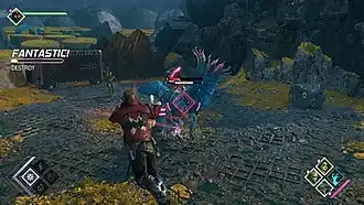 As the Guardians engage in combat, a Momentum gauge will fill, allowing the player to perform a "Call-to-Action" attack which deals significant damage to stronger enemies.[2] Some enemies also have a "stagger bar" which temporarily stuns them when depleted.[7] Defeated enemies drop pick-ups which replenish Star-Lord's health. As the player progresses through the game, they earn experience points which can be used to unlock new abilities for team members.[2] Another meter that fills during combat allows the player to perform a special ability called "Team Huddle", which briefly stops the fighting and prompts Star-Lord to make a motivational speech, accompanied by background music, to inspire his teammates. A good speech will grant the other Guardians combat bonuses and revive all fallen Guardians, though Star-Lord's abilities will be boosted regardless of the quality of the speech.[3][8] Players have to listen to what the Guardians are saying and observe their emotional states in order to select the best response option during Team Huddle.[9]
