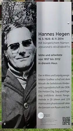Hannes Hegen (real name Johannes Eduard Hegenbarth; 16 May 1925 – 8 November 2014[1]) was a German illustrator and caricaturist and is most famous for creating the East German comic book Mosaik and its original protagonists, the Digedags.