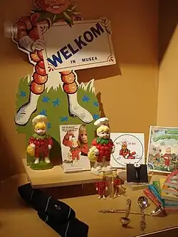 In 1935, Beek started to draw the comic strip Flipje for the jam factory "De Betuwe". It was a metre long and was displayed on shelves in front of the jam jars in stores.[2] Beek's wife, Freddie Langeler (1899–1948), herself an artist, wrote the rhyming text for the strip and coloured in the drawings. In 1936, a printer named De IJssel produced a cardboard theatre which could be used to display the comic strip as a slide show. It was illuminated from behind with a flashlight. It was dubbed the "Flipposcoop" (Flipposcope) and Flipje appeared in a special strip with instructions on how to assemble and load the theatre.[2]