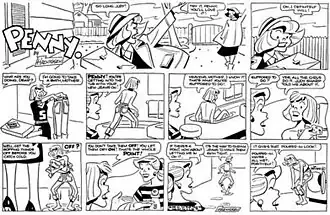- Penny was a gag strip about the life of a confident, self-assured teenage girl, her oft-mystified parents and her friends, dates and such. It was amiably, breezy, funny—comfortable rather than edgy in any way—but the thing that made it stand out was the art. Harry Haenigsen, who also drew Our Bill, gave Penny Pringle the cheekbones of Katharine Hepburn, a chin that could cut glass, and a stylized coltish charm that just arrested the eye. Penny was fluff, but the graphics of it were bold and engaging, whether Penny's sprawling upside down in an armchair as she gabs on the phone, in a raccoon coat cheering on her school football team, wearing bluejeans in the bath to make sure they shrink right, or whatever else she did. The strip is a charming portrait of mid-century suburbia and teen-agia, light as a meringue and crisp as autumn leaves.[5]