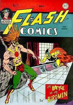 The Golden Age Hawkman was also granted the ability to breathe underwater by the sea god Poseidon.[5] He also discovered a hidden kingdom of sentient birds led by the old One-Eye, who taught him their language and later sacrificed himself to save Hawkman's life.[6] Among the leading birds was a hawk named Big Red who became a companion and even helped the Golden Age Hawkman solve crimes.[7]