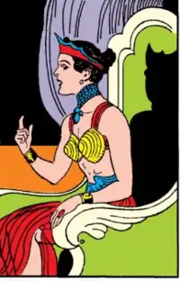 For the most part, Hippolyte remained on Paradise Island during the Golden Age era, rarely interacting with the modern world to which her daughter had journeyed. Her role was that of the Amazon Queen and mentor to Wonder Woman. She was devoted to the Olympian goddesses, particularly the Amazons' patron Aphrodite, and was adamant that man never be allowed to set foot on Paradise Island. Although she remained mainly on the island, in one story from Sensation Comics #26 (reprinted in Wonder Woman: The Complete History), Hippolyte travels to Man's World and briefly assumes the role of Wonder Woman.[4] In the first appearance of Villany inc she is kidnapped to lure Wonder Woman into a trap.