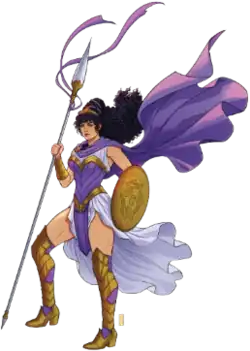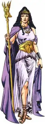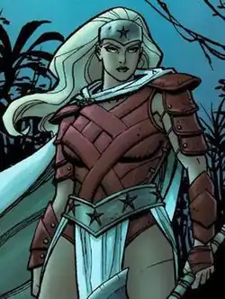 Diana, after her death, was granted divinity as the Goddess of Truth by her gods for such faithful devotion.[26] During her brief time as a god of Olympus, Diana was replaced in the role of Wonder Woman by her mother.[27] As opposed to Diana receiving the title in honor, Hippolyta's role as Wonder Woman was meant to be a punishment for her betrayal in Artemis' death as well as for unintentionally killing her own daughter.[28] However, Hippolyta eventually grew to enjoy the freedom and adventure the title came with. Whereas Diana used the Lasso of Truth as her primary weapon, Hippolyta favored a broadsword and wore a short blue skirt instead of briefs.