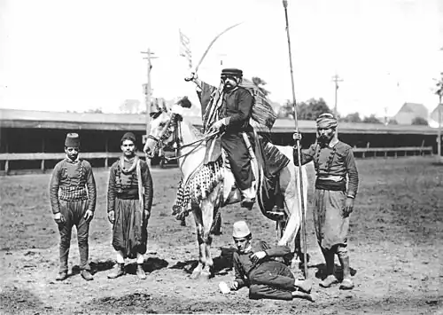 Upon arrival, the Iradé was authenticated, and clarified that Davenport would be allowed to export both mares and stallions.[80] Davenport's accomplishment was notable for several reasons. It was the first time Arabian horses officially had been allowed to be exported from the Ottoman Empire in 35 years.[81] It was also notable that Davenport not only was able to purchase stallions, which were often available for sale to outsiders,[82] but also mares, which were treasured by the Bedouin; the best war mares generally were not for sale at any price.[83]