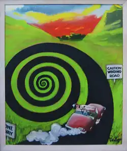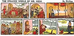 As a cartoonist, he created the comics series Scuffy, which ran from 1945 to 1951.[5] From 1958 to 1974, Phillips produced his best-known work, The Strange World of Mr. Mum, a pantomime panel which ran in 180 newspapers in 22 countries.[3] It was initially distributed by the Hall Syndicate and later by the Field Newspaper Syndicate. There was no Sunday edition until 1961. Mr. Mum was a portly, bald and bespectacled character, who—as his name suggests—silently observed various odd, surprising or even surreal scenes. He was sometimes accompanied by his similarly silent dog. Mum was described as a "bystander on life's outer limits," and the feature's anything-can-happen humor is cited as paving the way for such later strips as Herman, The Far Side, Rhymes With Orange and Bizarro.[6] With never a word of dialog, the humor of the strip translated well internationally; this was an interesting stylistic choice given Phillips' résumé as a professional screenwriter.