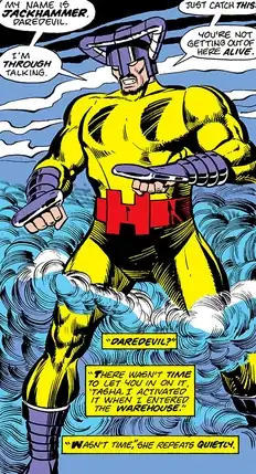 Jackhammer is a costumed agent/division leader of HYDRA when it was under the leadership of the crime lord Silvermane. When they arranged a kidnapping of Foggy Nelson, Daredevil, Black Widow, and S.H.I.E.L.D. pursued them. Jackhammer was among those who fought Daredevil and was defeated.[4]