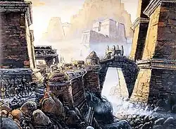 In October 1985, Mézières was contacted by the German director Peter Fleischmann who proposed to adapt Russians Arkady and Boris Strugatsky's 1964 novel Hard to Be a God into a film. This was to be the first major German-Soviet co-production. Mézières travelled to Moscow to join the production team and also to Uzbekistan where it was proposed to shoot the film. Travelling from there to Munich, he produced several concept drawings and paintings over a three-month period before the project was suspended due to funding difficulties. At this point Mézières left the production and returned to France. Filming was eventually scheduled to begin in April 1986 in Kyiv and Mézières re-joined the production, creating storyboards for some scenes. However, at this time the Chernobyl disaster occurred only 100 km from Kyiv and production was again halted. The film was eventually finished in 1989, but Mézières' concepts were barely used. Again, many of Mézières' designs were later published in Les Extras de Mézières.[16]