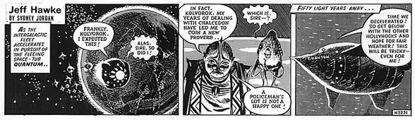 Jeff Hawke was a British science fiction comic strip created by Sydney Jordan. It was published in the Daily Express from 15 February 1955 to 18 April 1974, by which point Jordan had "written or co-written and drawn 6,474 episodes."[1] Despite its obscurity in English-speaking countries, it is often regarded as one of the most important science fiction comics ever released, especially in Italy and Scandinavian countries.