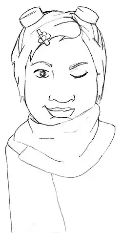 She has short, dark hair. She usually wears aviation goggles on top of her head and a scarf around her neck. Otherwise, she dresses in comfortable clothes. She is average size and has a good body image. She has loads of confidence and charisma. She appears to be Asian or Native American. She has a ready smile.[2]