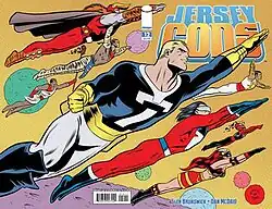Jersey Gods is a comic book published by Image Comics. It was written by Glen Brunswick, pencilled and inked by Dan McDaid, with colors by Rachelle Rosenberg. The covers were drawn by Mike Allred and coloured by Laura Allred.[1] Alternative covers were also provided by Dan McDaid, Darwyn Cooke, Paul Pope and Whilce Porticio. A back-up strip, Tales from the Great War, was written by Mark Waid and drawn by Joe Infurnari.[2] Prior to publication, teaser strips appeared in Popgun volume 2 and Invincible #55.