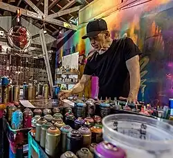 The period of record sleeves and skate posters ran parallel to commissions for a number of film posters.[8] Working for most of the major studios, Jim completed art for Lumière, 20th Century Oz, I Never Promised You a Rose Garden, The Kentucky Fried Movie, Big Wednesday, Herowork, Acapulco Gold, The Space Movie, Patrick, Neil Young's Rust Never Sleeps (for which Jim also animated the opening title sequence), and John Carpenter's first film Dark Star. Numerous books began to appear at this time and his work is included in the History of Rock Art, Phonographics, Roger Dean's Album Art Book, and The History of Underground Comics.[9] An interest in film led to work as an art director, set decorator, and storyboard artist for films. Evans worked on Killer's Kiss and Growing Pains. He also helped to prepare an American release for a series of Japanese films called The Baby Cart Series. Working with director Robert Houston and his partner David Weisman, Jim created the poster and title treatment for the 1980 release titled Shogun Assassin, Jim's son Gibran Evans voiced the narrative as Daigoro. An ongoing creative collaboration with John Hegeman, president of Orion Pictures, led to Jim illustrating promotional posters for the Saw films for Lionsgate, The Green Inferno for BH Tilt, the film Mirrors for New Regency, Anna and the Apocalypse and a poster-centric street art image for Child's Play.