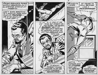 - ↑ Manning "1960s" in Gilbert (2012), p. 49: "In this tale written by [Stan] Lee and drawn by the team of John Buscema and Jim Mooney, window washer Hobie Brown became fed up with his dead-end job and used his inventive mind to craft the identity and weapons of the Prowler."