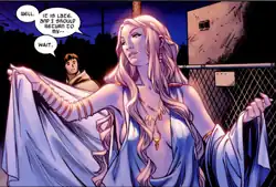 Not much is known about Kelda before the events of Ragnarök,[1] she is one of the many Asgardians brought back to life by Thor after he recreates Asgard in Oklahoma. She is first seen walking alone, enjoying the Oklahoman night where she meets Bill, a short-order cook at a local diner.[2] Bill later visits Kelda in Asgard, the pair quickly fall in love and consummate their relationship.[3][4]