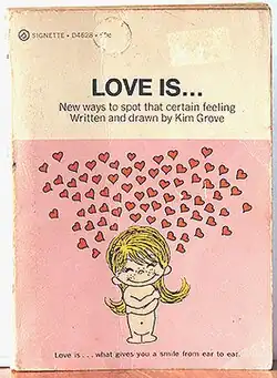 Casali's obituary published in The Times related that after she and Roberto became engaged, Casali took a job as a receptionist for a design company, "and made up little booklets of her winsome cartoons, which she sold for a dollar apiece. Word soon spread and the demand for Love is... escalated. Roberto recognised their commercial potential and showed them to an American journalist."[6] Although other sources differ regarding whether it was Roberto or Casali herself who first showed the cartoons to an acquaintance working for the Los Angeles Times, the newspaper picked them up for publication and published the first of the series on 5 January 1970, under the pen name "Kim".[2][10][12][13] The cartoon's release coincided with the wave of success of the novel Love Story (1970) by Erich Segal, and the subsequent movie of the same name starring Ali MacGraw as a girl dying of an incurable disease and Ryan O'Neal as the student who worshiped her. The film's slogan was "Love means never having to say you're sorry." Casali altered it into one of her most famous cartoons: "Love is... being able to say you're sorry."[14]