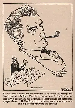 Hubbard's most famous work was his creation of the cartoon character Abe Martin, "a rustic character that made a habit of commenting on legislators' foibles".[18] His first Abe Martin drawing appeared in the Indianapolis News on December 17, 1904.[25] The popular cartoon series, which remained the main focus of the cartoonist's work for the remainder of his life, was featured six days a week on the back page of the News for twenty-six years. It also appeared in syndication beginning in 1910.[26][27]