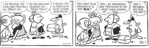 King Aroo is celebrated largely among devotees of comics, and appealing to the members of the readership that loved Krazy Kat, Barnaby, Pogo and Little Nemo. The King was the creation of Jack Kent, born in Burlington, Iowa, in 1920. It was probably Kent's lack of formal art training that led to a loose-lined art style, with panels full of characters and activity. It was surely his innate artistic ability that kept those panels from looking cluttered. The strip began in 1950 in national syndication but was discontinued after a few years. It was kept on in limited syndication until 1965 by Stanleigh Arnold's small Golden Gate Features.[4]