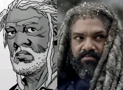 ![]() King Ezekiel, as he appears in the comic book series (left) and as portrayed by Khary Payton on the television series (right) | |