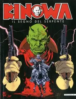 The Western comic series debuted in May 1950, with text by Andrea Lavezzolo (who signed the comics with the pen name A. Lawson) and artwork by the trio EsseGesse (Pietro Sartoris, Dario Guzzon and Giovanni Sinchetto), at their debut.[1] When Essegesse passed to draw other comics - as Blek Macigno and Captain Miki - the stories of Kinowa were illustrated by Pietro Gamba.[2] The main character of the series is Sam Boyle, a man that, scalped and left for dead after an attack on the convoy in which perished his wife and son, builds a duck skin mask with the likeness of the devil and, turned into the avenging spirit Kinowa, persecutes the descendants of his attackers.[1]