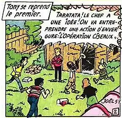 Based on a script by Marcel Denis, Loeckx, under the pen-name Joël, drew a four-page strip called Opération ciseaux (French for "Operation Scissors"). The gang's HQ was an old shack in a neighbourhood yard. Most of them appeared to be in their teens and included Tony, the blond-haired leader; Filasse, the artist; Michette, the fiery and heavy-handed only girl; Michel, the slingshot champion; Dizzi, the musician; and a much younger boy whose name was not mentioned.