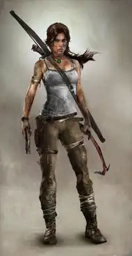 Crystal Dynamics focused on believability rather than realism to re-develop the character, posing decisions around the question, "What could Lara do?", and giving her action more freedom.[47] The designers updated Lara Croft's move set to make her movements appear more fluid and continuous. The animations were also updated so the character could better interact with environmental objects.[42] The developers introduced a feature that causes the character's skin and clothing to appear wet after swimming and dirty after rolling on the ground.[42][48] Responding to criticism directed at the character controls in The Angel of Darkness, Crystal Dynamics redesigned the character's control scheme to provide what it felt was the best third-person action experience.[43] The developers also introduced close-quarter melee manoeuvres.[49] Crystal Dynamics updated the character model to add more realism, but retained past design elements.[42][48] The polygon count increased to over 9,800. More attention was paid to the character's lip synching and facial expressions to allow for dynamic emotional responses to in-game events.[42] In redesigning the character's appearance, Crystal Dynamics updated Croft's hairstyle, wardrobe, and accessories. Her shirt was changed to a V-neck crop top, her body was given more muscle tone, and her hair braid was switched to a ponytail.[9][10][43] The voice actor for Lara Croft was initially rumoured to be Rachel Weisz, but the role was eventually given to Keeley Hawes.[19][50][51] Crystal Dynamics retained the design changes for the next game, Tomb Raider: Anniversary, a remake of the first game.[19][52] The designers aimed to portray Croft with more emotional depth, and focused on the character's desire to achieve the end goal of the game, culminating in killing one of the antagonists. The developers used the death to evoke guilt in Croft afterward and illustrate that shooting a person should be a difficult choice.[53]