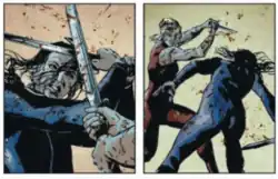 Issue 15 features a silent, thirteen-page fight between two characters.[20][21] Rucka, who used to be a choreographer, filmed himself acting out the battle with a friend. Lark used the film for reference as he drew.[15]