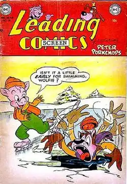 When the superhero genre faded in popularity in the late 1940s, DC Comics decided to focus more on other genres, such as science fiction, westerns, humor and romance. Leading Comics led the charge as the first DC title to drop its superheroes. With its Summer 1945 issue #15, Leading switched to talking animals, with the introduction of Nero Fox (a fox who was billed as the "jive-jumpin' emperor of ancient Rome").[2] In issue #23 (February–March 1947), Nero Fox was dropped as the cover-featured first story in each issue, to be replaced by Peter Porkchops, a pig (created by Otto Feuer), in his first appearance. Peter appeared in Leading Comics (retitled Leading Screen Comics with #34 in 1948) regularly until issue #77 (August–September 1955).