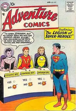 Although intended as a one-off story focusing on Superboy, the Legion proved so popular that it returned for an encore in Adventure Comics #267 (December 1959). In this story, Lightning Boy had been renamed Lightning Lad, and their costumes were close to those they wore throughout the Silver Age of Comic Books. The Legion's popularity grew, and they appeared in further stories in Adventure Comics, Action Comics, and other titles edited by Mort Weisinger over the next few years.[2] The ranks of the Legion, only hinted at in those first two stories, was filled with new heroes such as Chameleon Boy, Invisible Kid, Colossal Boy, Star Boy, Brainiac 5, Triplicate Girl, Shrinking Violet, Sun Boy, Bouncing Boy, Phantom Girl, Ultra Boy, and Supergirl.[3]