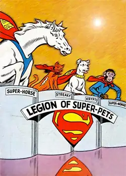 The Legion of Super-Pets is a fictional team of superhero pets in the DC Universe. The original membership included Krypto, Streaky the Supercat, Beppo, and Comet, with the shape-shifting alien Proty II later joining.[1] The team first appeared in Adventure Comics #293 (February 1962), although all of the members except for Comet had appeared individually in earlier issues.[2] The group was removed from mainstream DC Comics continuity in 1986, but a new version appeared in mainstream comics in 2017.