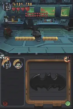 The core gameplay of Lego Batman is similar to that of previous Lego video games, such as Lego Indiana Jones: The Original Adventures and the Lego Star Wars series.[3] The player controls any one of a wide assortment of characters from a third-person perspective, primarily fighting enemies, solving puzzles, and collecting Lego "studs", the game's form of currency. Using attack combinations in combat will multiply the amount of studs earned. Studs can be utilized to purchase different powerups or customization options.[4] The game is set in Gotham City, with mainly realistic environments; only interactive objects are made of Lego bricks. Occasionally, players must assemble Lego objects to proceed further in the level, cross obstacles, or unlock new suits.[5] Players are able to fight on land, sea, and in the air, using a number of character-controlled vehicles, including the Batmobile, Batboat, and Batwing. New moves to the series first featured in Lego Indiana Jones: The Original Adventures are featured in this game. New abilities introduced in this game include picking up and carrying enemies and walking on tightropes across buildings. Up to two players can play in co-operative mode,[6] except in the PSP version which does not feature this mode.[7]