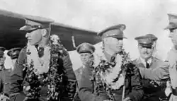 23 hours into the flight, before dawn on June 29, the crew observed a lighthouse beam on Kauai in the Hawaiian Islands at their estimated time of arrival, but still in complete darkness, decided to circle until daybreak before landing at Wheeler.[10][11][12] The Bird of Paradise completed its trip of 2,407 miles (3,874 km) in 25 hours and 50 minutes, and was greeted by thousands of spectators.[11][12] In becoming the first to make the transpacific crossing to Hawaii, Maitland and Hegenberger earned the third awarding of Distinguished Flying Cross by the Air Corps and received the Mackay Trophy for that year.[5] Of the feat, the official history of the United States Air Force states: