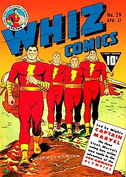 ![]() Captain Marvel and his three Lieutenant Marvels (left to right: Lt. Hill Marvel, Lt. Fat Marvel, and Lt. Tall Marvel) on the cover of Whiz Comics #29 (April 1942) by C. C. Beck. | |