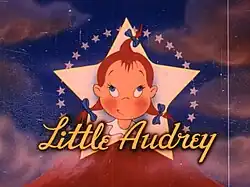 Little Audrey (full name: Audrey Smith) is a fictional animated cartoon character, appearing in early 20th century comics[1] prior to starring in a series of Paramount Pictures' Famous Studios cartoons from 1947 to 1958.[2] She was devised after Paramount decided not to renew the license on Little Lulu, the comic strip character created by Marjorie Henderson Buell (a.k.a. "Marge"). Despite some superficial similarities between the two characters, the Famous animators were at pains to design Audrey in contrast to Lulu, adopting an entirely different color scheme and employing the stylistic conventions common to Famous Studios' later 1940s repertoire, as opposed to Buell's individualistic rendering of Little Lulu. Veteran animator Bill Tytla was the designer of Little Audrey, reportedly inspired by his daughter Tammy (who was also his inspiration for Famous' version of Little Lulu, on which he also worked and for which he directed several shorts).[3] The original voice of Little Lulu was performed by actress Cecil Roy (who also provided the voice of Casper the Friendly Ghost). Little Audrey was, instead, voiced by Mae Questel, who also voiced most of Paramount's other major female cartoon characters, including Betty Boop and Olive Oyl from the Popeye cartoons.