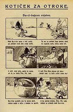 Little Negro Bu-ci-bu (Slovene: Zamorček Bu-ci-bu),[1] also mentioned as Buci-Bu,[2] was the first Slovene comic strip.[3] It was created by Milko Bambič and published in 1927 in the children's column of the monthly Naš glas (Our Voice) in Trieste.[4] It is a story about an arrogant and tyrannical black king that with his false wisdom leads his people to ruin[5] and commits suicide.[6] It caused a controversy, because it was seen as a parody on the Italian leader Mussolini,[6] and the author predicted his demise.[3] The Italian Fascist authorities forbade Bambič's works.[6] He escaped from Trieste to Yugoslavia to avoid arrest.[4]